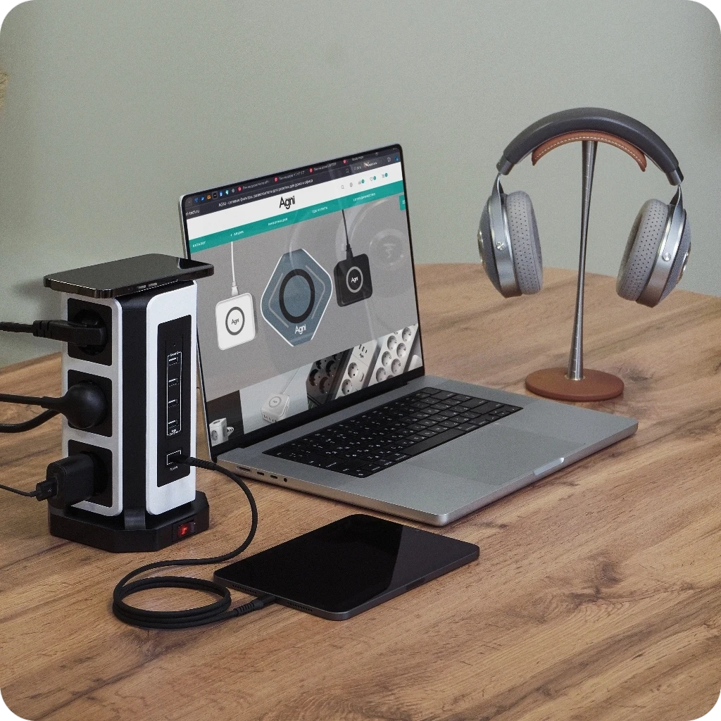 Сетевой фильтр AGNI TP-VD5U9E-C сочетает инженерную надёжность, функциональность и современный дизайн. Это универсальное решение, способное одновременно питать крупную бытовую и офисную технику, а также быстро заряжать мобильные устройства — без потери мощности и избыточных проводов.