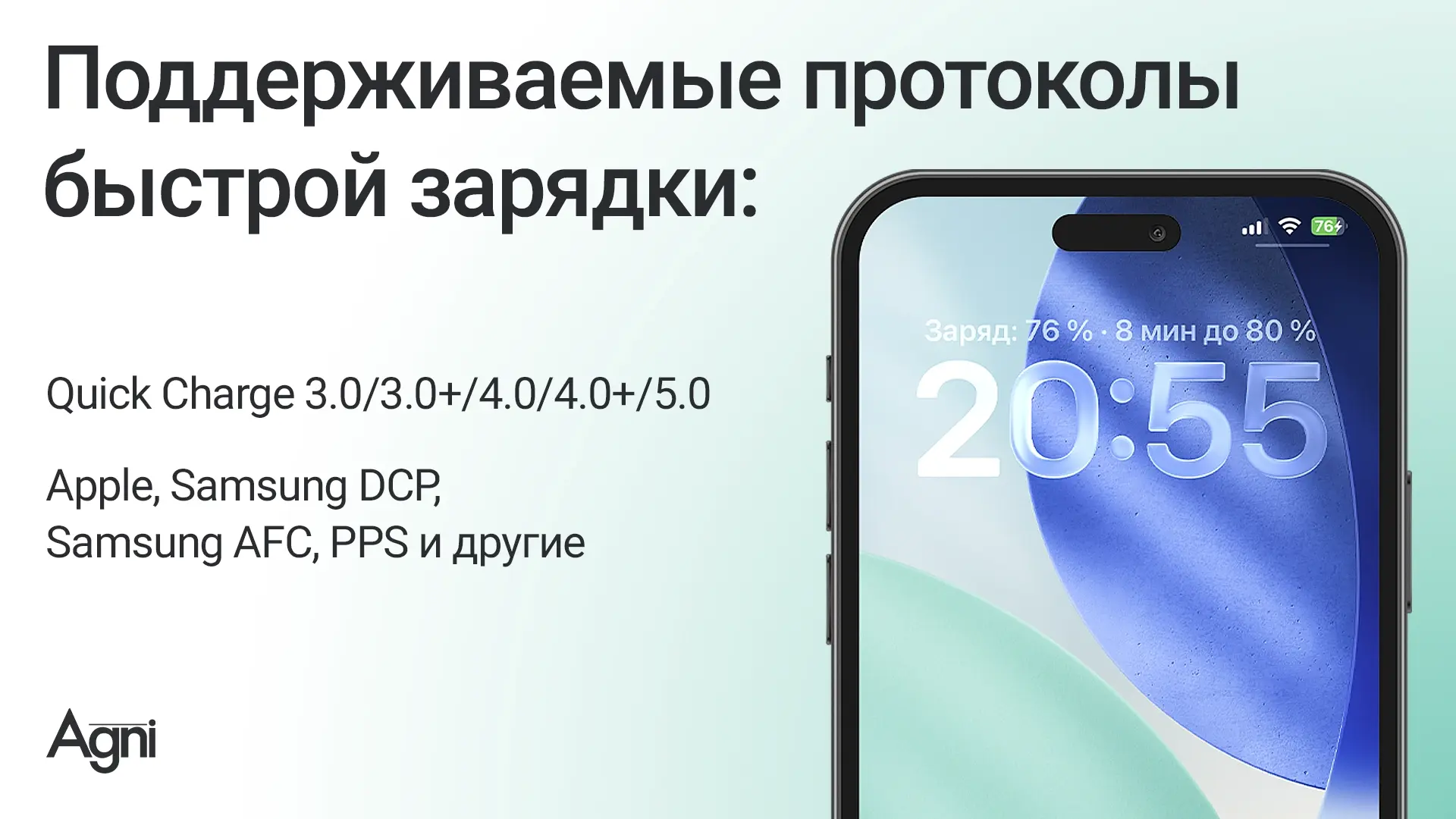 Высокая скорость и стабильность- Поддержка быстрой зарядки с током до 3 А и совместимость со следующими протоколами:
