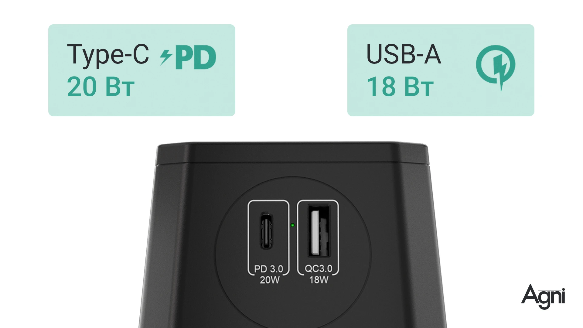 - 1 разъем USB Type C с поддержкой быстрой зарядки Power Delivery 3.0 — обеспечивает интеллектуальную подачу мощности и безопасную зарядку смартфонов, планшетов и часов;